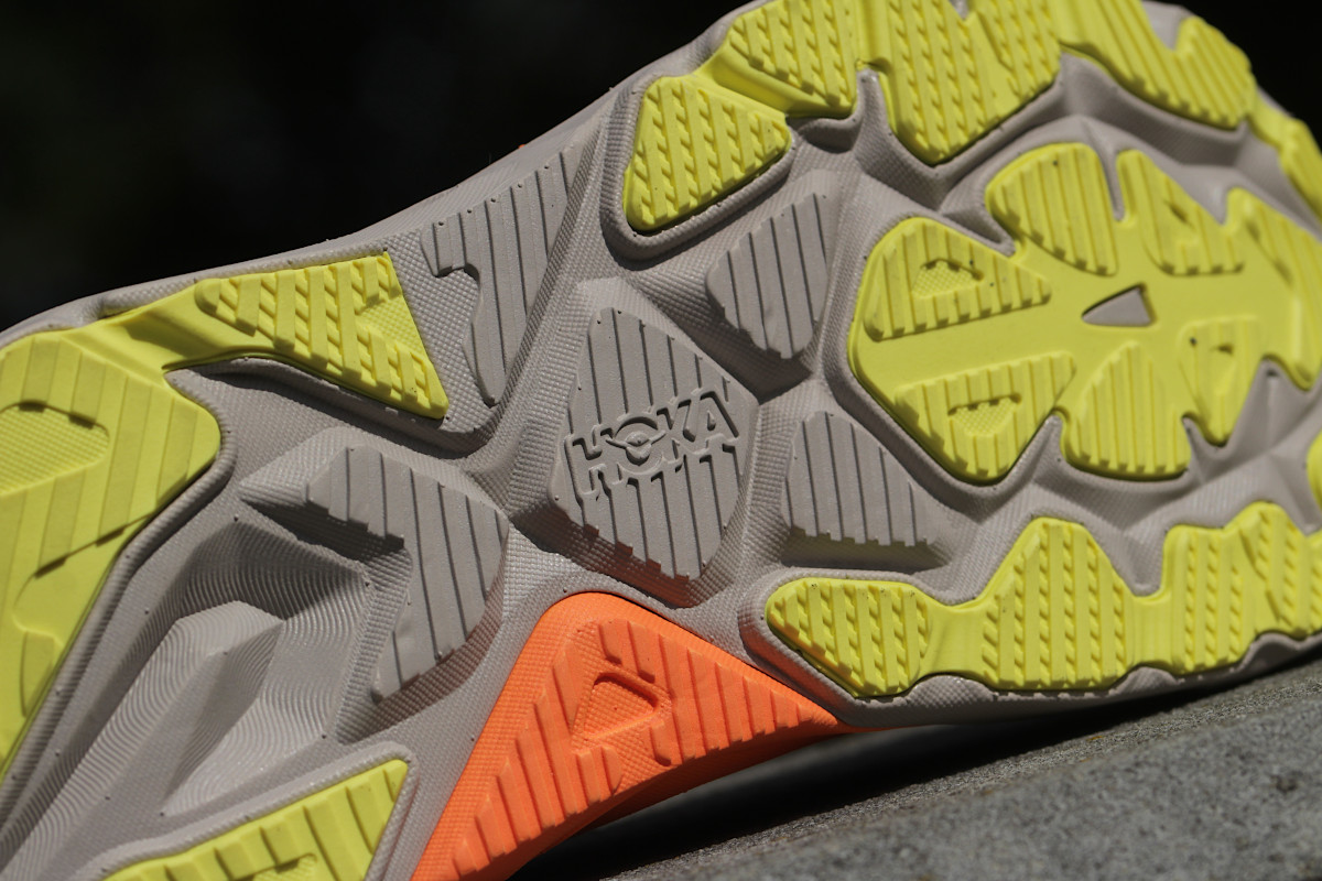 Bieżnik w Hoka Arahi 8 nie przeszedł rewolucji względem poprzedniego modelu. Ma umiarkowanie agresywny wzór, typowy dla butów przeznaczonych głównie na twarde nawierzchnie. Głębokość faktury tak samo jak w poprzednim modelu wynosi 1,4 mm ale dodatkową fakturę zapewniają delikatne zagłębienia w piance. Całość tworzy uniwersalną podeszwę, która zapewnia pewną przyczepność na różnorodnych utwardzonych nawierzchniach. Arahi 8 świetnie radzi sobie na miejskim asfalcie, ale poradzi sobie również na drogach szutrowych czy leśnych ścieżkach, zachowując stabilność i komfort biegu.