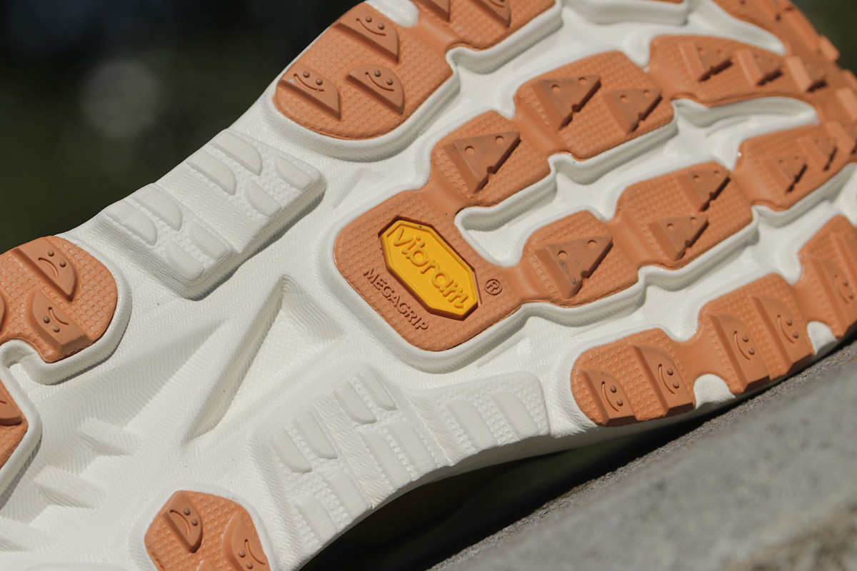 Bieżnik w Mafate X opiera się na sprawdzonej mieszance Vibram Megagrip, czyli jednej z najlepszych gum w trailu. Zapewnia pewny chwyt zarówno na suchym, jak i mokrym podłożu. Kołki są umiarkowanej wysokości – około 3,5 mm według producenta i 3,2 mm według mojego pomiaru. Nie jest to bardzo agresywny, górski bieżnik. Bliżej mu do konstrukcji typu door-to-trail niż do typowych „błotnych glebogryzarek”.